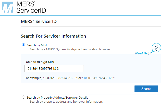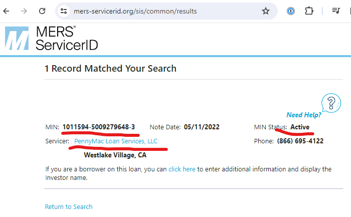 Once you click on "Search" the results will show you who the current servicer is; in this case it's PennyMac Loan Services, LLC: